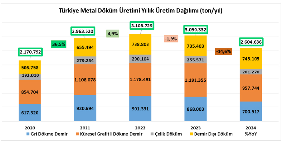 Türkiye’nin 2024 metal döküm üretimi, bir önceki yıla kıyasla yüzde 14,6 oranında düşüşle 2,6 milyon ton olarak gerçekleşti. Demir döküm üretimindeki düşüş, genel üretim daralmasının temel nedeni oldu. Demir döküm üretimi %19,7 oranında azalarak yaklaşık 1,86 milyon ton seviyesine geriledi. Gri dökme demir üretiminde %19,3, sfero döküm üretiminde ise %19,6 düşüş yaşandı.