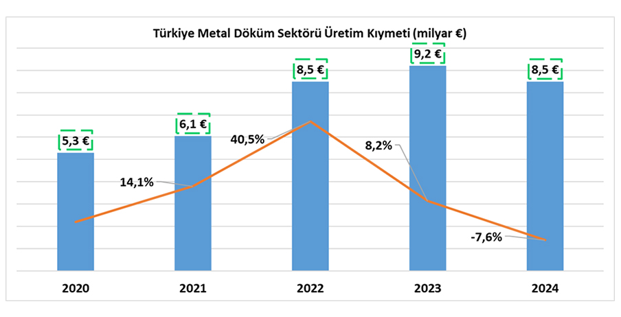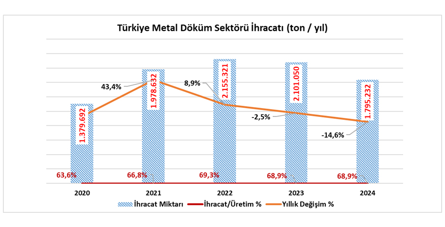 2024 yılı toplam sektör cirosu yüzde 7,3 azalarak yaklaşık 8,5 milyar Euro olarak gerçekleşti. Toplam ciro içinde ihracatın payı yüzde 74,4 seviyesinde olmasına rağmen, ihracat hacmi özellikle demir ve çelik döküm tarafındaki zayıflık nedeniyle yüzde 14,6 oranında azaldı ve bir milyon sekiz yüz bin tona geriledi. Demir dışı döküm grubunda ise alüminyum döküm ihracatı bir önceki yıla göre %2,4’lük bir büyüme kaydetti ve beş yüz otuz sekiz bin tondan beş yüz elli bir tona yükseldi.