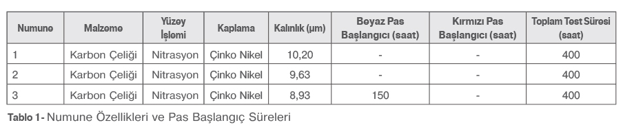 Birinci numune karbon çeliğinden üretilmiş olup nitrasyon işlemi uygulanmıştır. Kaplama kalınlığı 10,20µm olarak ölçülmüştür. Test süresi boyunca kırmızı pas gözlemlenmemiştir. Kaplama kalınlığı, 400 saat boyunca korozyon başlangıcını engellemiş ve tabakanın performansının yeterli olduğunu göstermiştir.