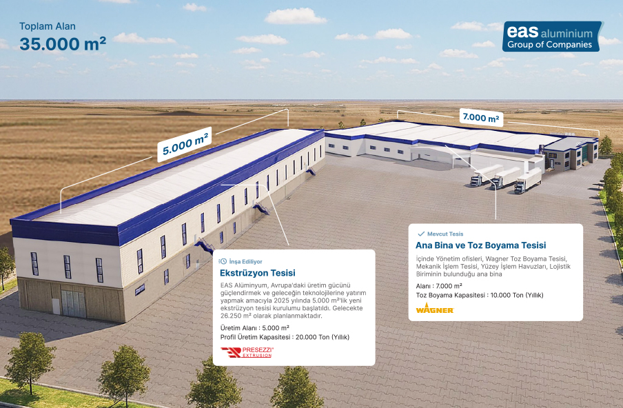 Uzun vadeli büyüme stratejisinin bir parçası olarak EAS Aluminium, Edirne Organize Sanayi Bölgesi’nde 35.0002’lik yeni ekstrüzyon tesisinin inşasına resmi olarak başladı. Bu stratejik yatırım, EAS’in Avrupa’daki operasyonlarında yeni bir dönemin başlangıcını simgeliyor. Yatırımla birlikte üretim kapasitesi artırılacak, operasyonel verimlilik geliştirilecek ve çevresel sürdürülebilirlikte yeni bir seviye hedeflenecek.