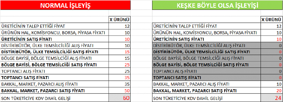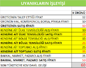 Fakat bizdeki asıl ve en önemli sorun şu: Bazı büyük firmalar aslında ürünü fabrika satış mağazası aracılığı ile çok uygun fiyata satabilme imkânına sahipler. Veya direkt tarladan alıp market rafına koyma imkânı var ellerinde. Peki bunlar neden piyasa fiyatının altına inmiyorlar? Çünkü bu firmalar benim ikinci tablomda sildiğim aracıları kendi kurdukları şirketler aracılığı ile oluşturup katlamalı kazanıyorlar da ondan.